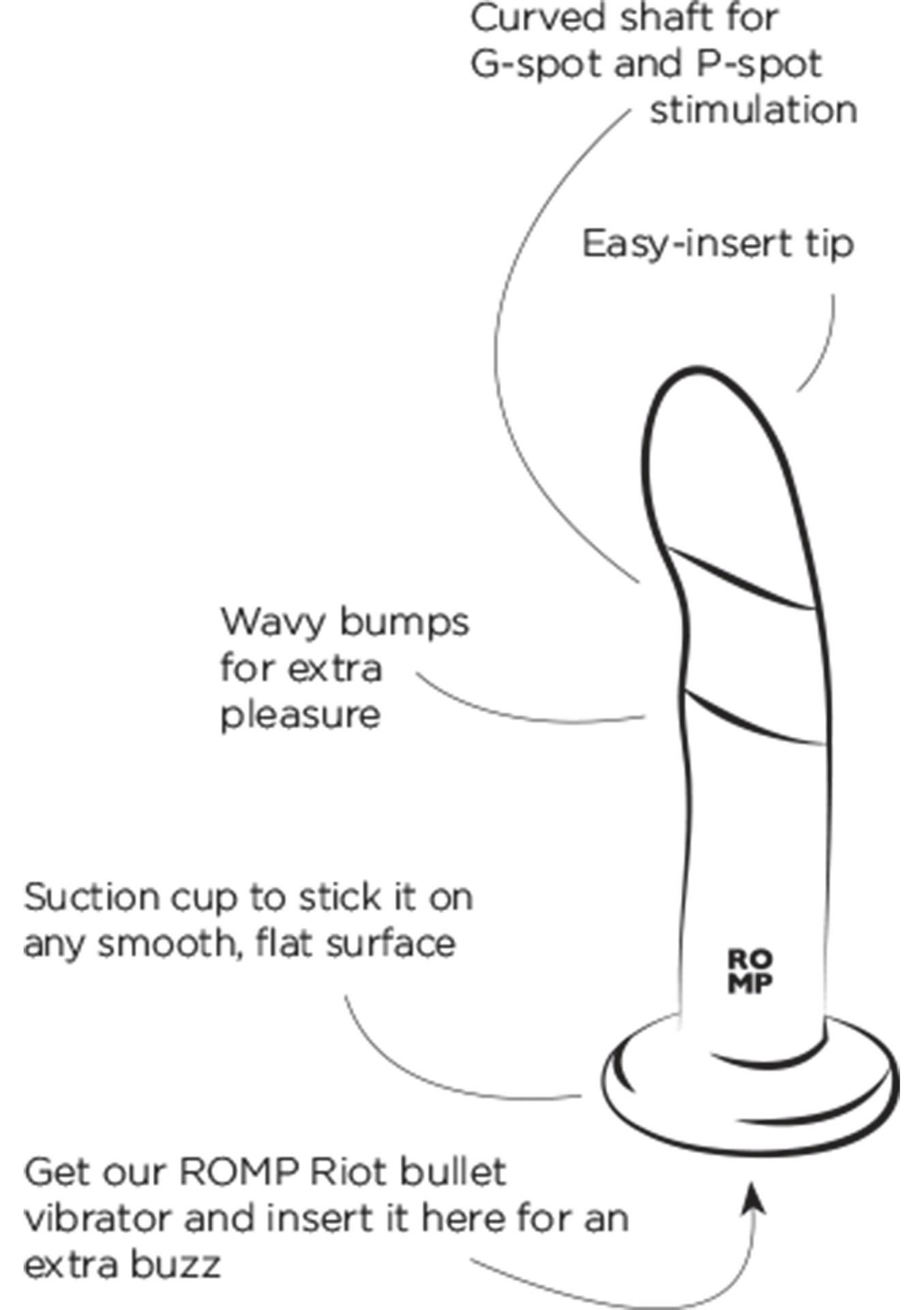 Dildo Romp Piccolo wykonane jest z delikatnego silikonu wysokiej jakości. Dzięki lekkiemu wygięciu delikatnie oddziałuje na strefy erogenne wewnątrz ciała, potęgując doznania i przyspieszając zbliżanie się do orgazmu. Specjalne złącze wewnątrz przyssawki jest przeznaczone do użytku z wibro pociskiem Riot (brak w zestawie), dzięki czemu otrzymujesz świetny wibrator do punktu G, a nawet prostaty.