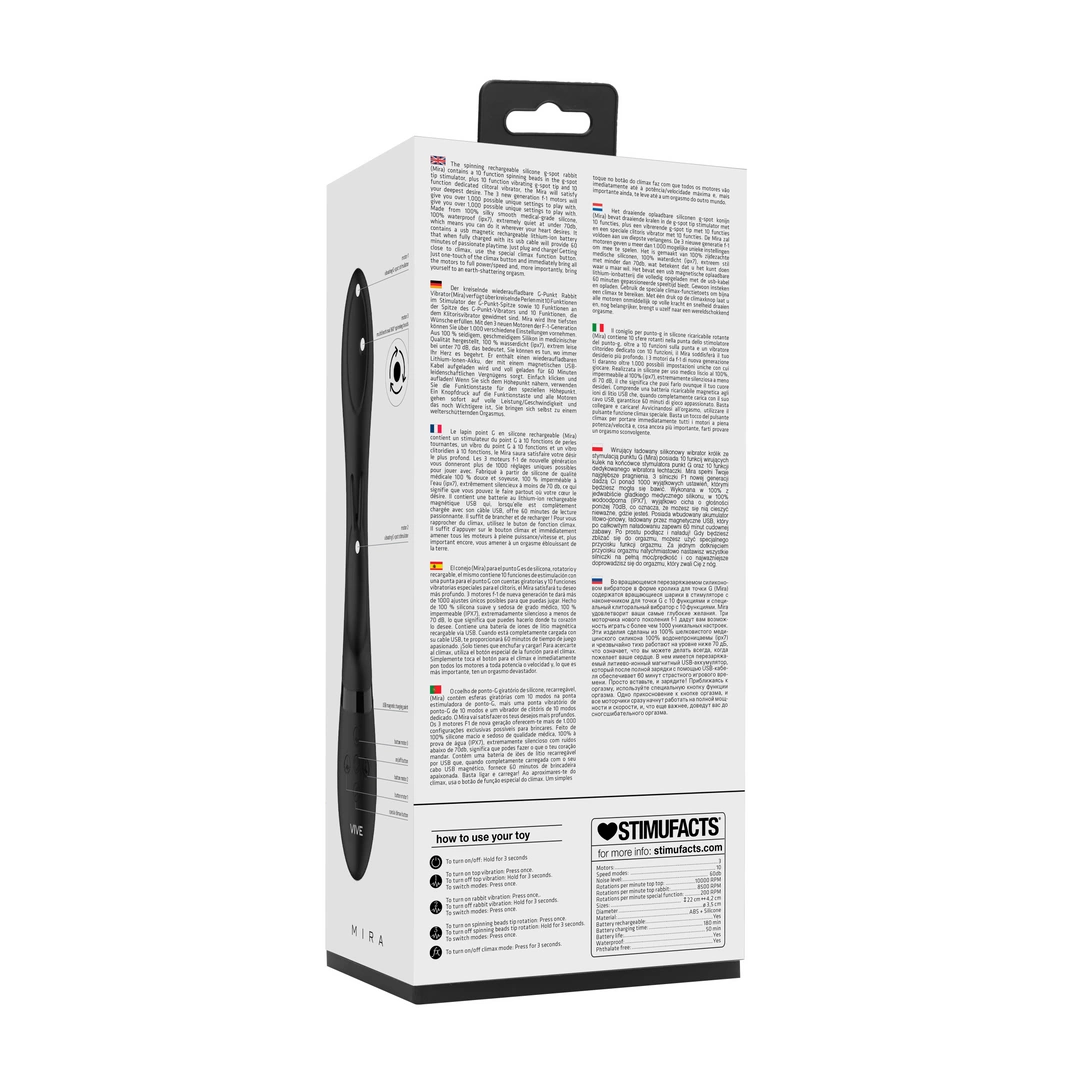 Urządzenie zawiera trzy mocne silniki F1 nowej generacji, zapewniające ponad 1000 unikalnych kombinacji wibracji i ruchów. Mira jest wykonana w 100% z jedwabistego silikonu medycznego, przyjemnego w dotyku i bezpiecznego dla ciała. Całkowicie wodoodporny (IPX7) i cichy (poniżej 60 dB) pozwala cieszyć się przyjemnością w dowolnym miejscu – nawet pod prysznicem lub w wannie.