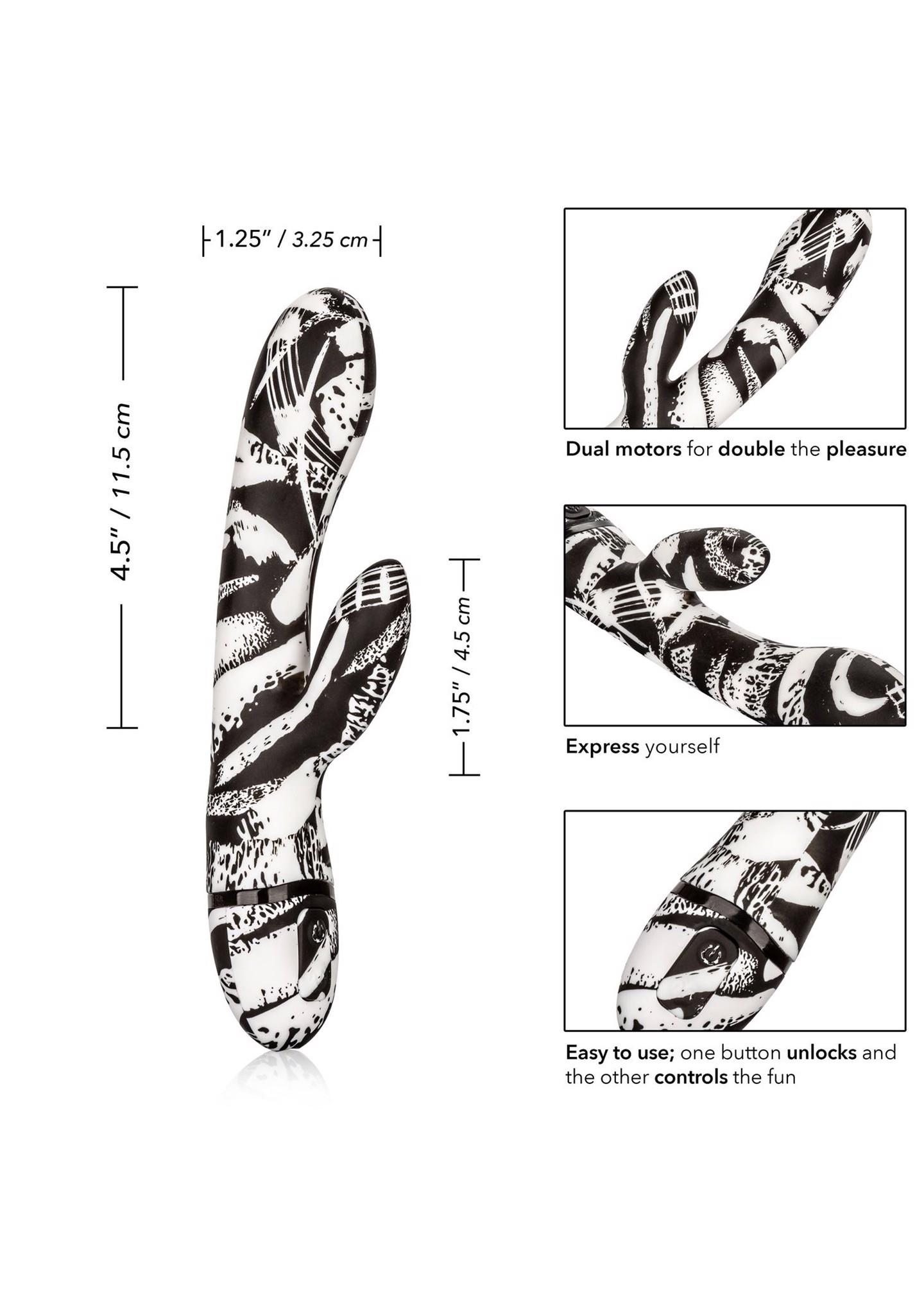 Hype Dual Wand оснащён двумя независимыми вибромоторами, которые дарят 10 режимов вибрации, пульсации и эскалации. Гибкий «кролик»-щекотун ласкает клитор мягкими ушками, в то время как изогнутый ствол точно стимулирует точку G. Каждый мотор управляется отдельно, позволяя вам полностью контролировать интенсивность и ритм ощущений.